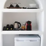 Kávé/tea készítő, hűtő és üvegáru szintén elérhetők a vendégek számára. Az Oia buszmegálló a közelben van, alig 250 méterre.